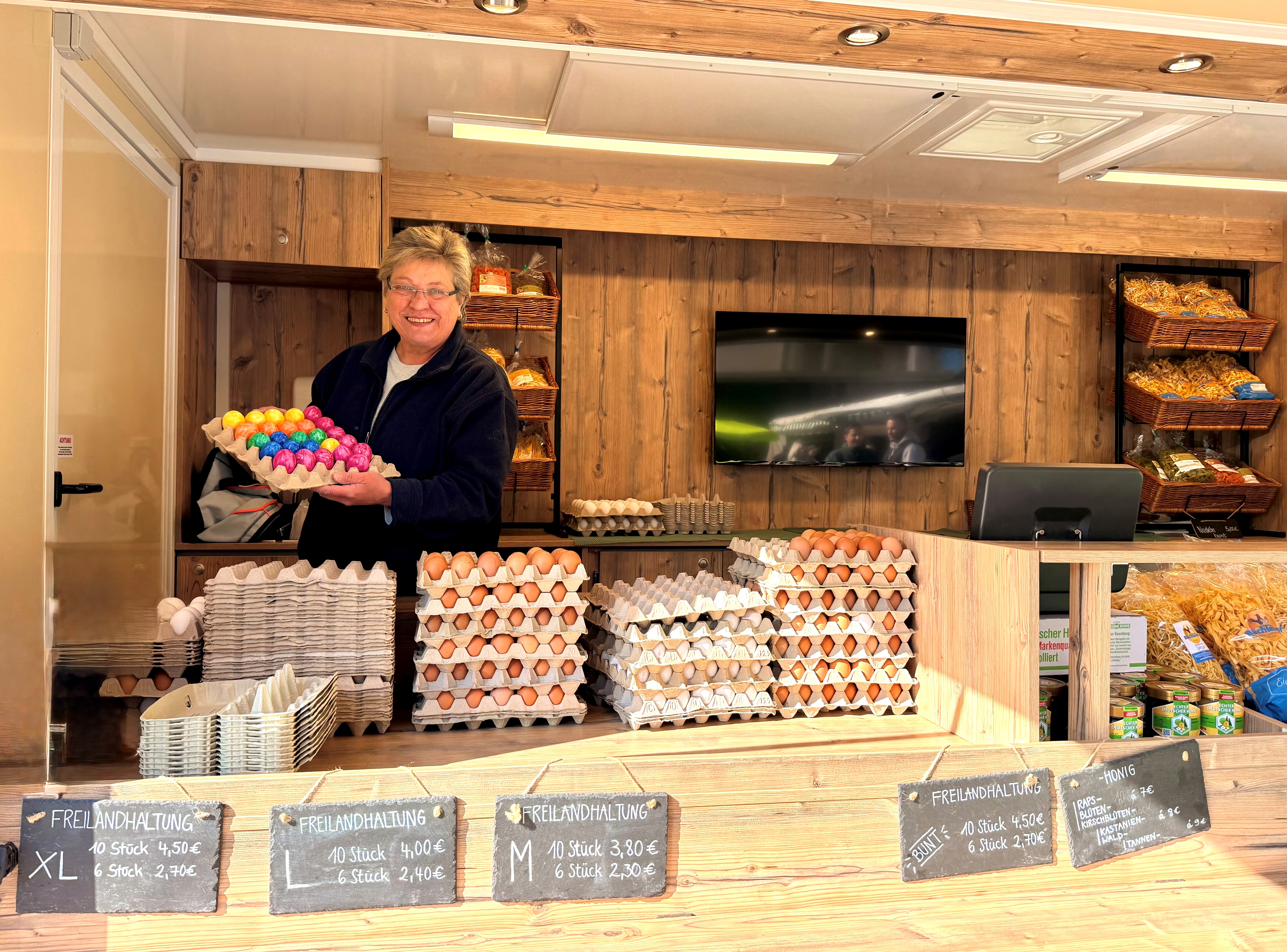 Angebotene Waren: Eier aus Freilandhaltung, Honig, hausgemachte Teigwaren, saisonales Obst