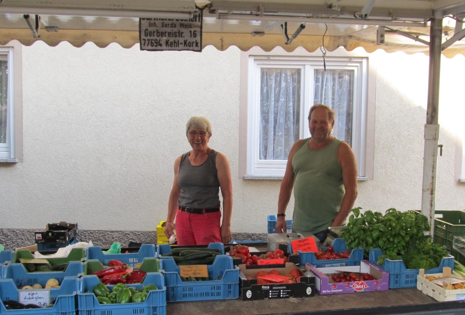 Angebotene Waren: Obst und Gemüse aus eigenem Anbau, Rahmkäse aus eigener Herstellung