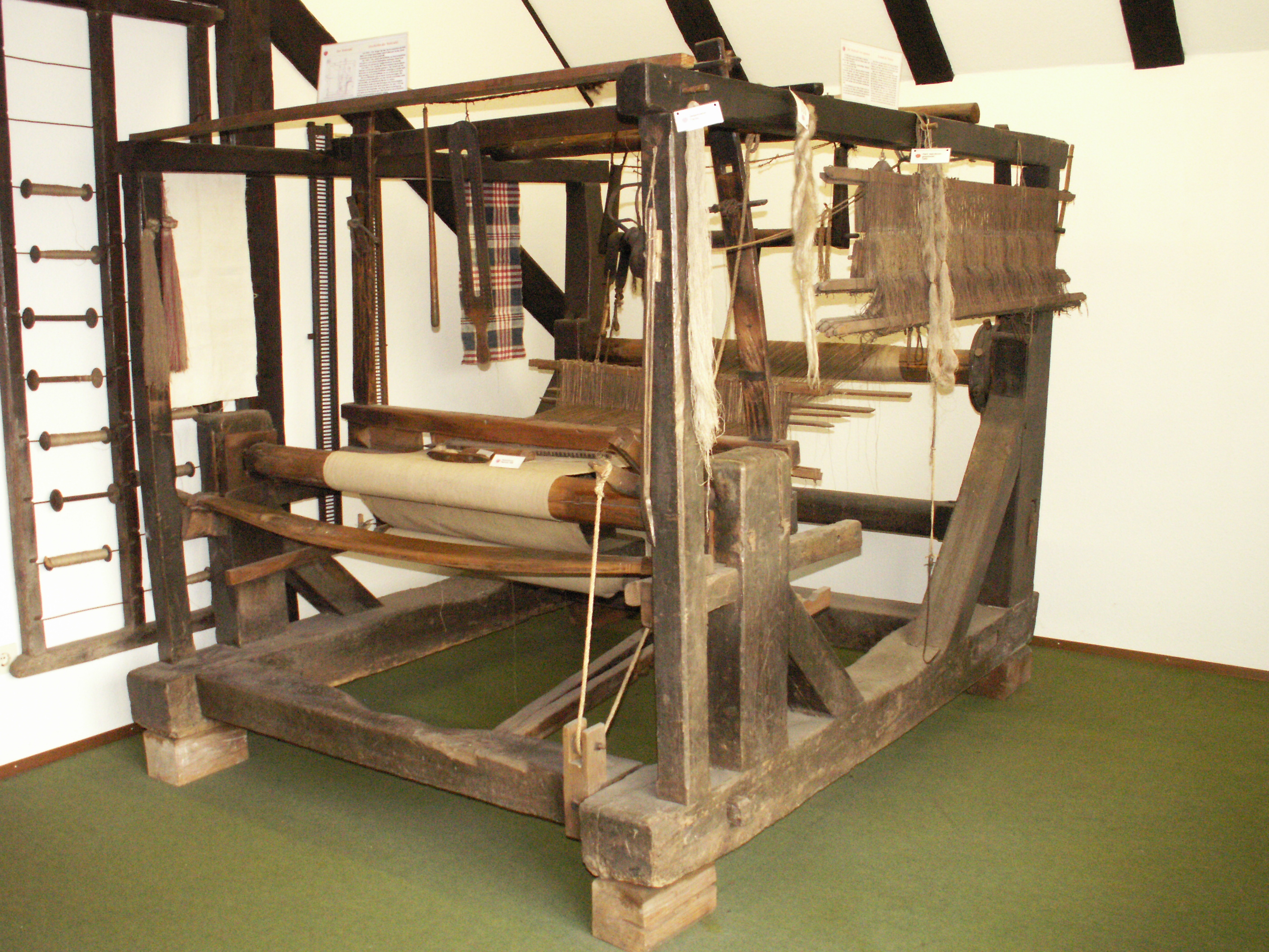 Die einfache Textilherstellung von der Hanfbreche über Spinnrad bis zum Webstuhl wird gezeigt anhand von gut erhaltenen Gerätschaften der im Nebenerwerb tätigen Tuchmacher. Im Bild der Webstuhl von vor 1800 mit Zubehör.