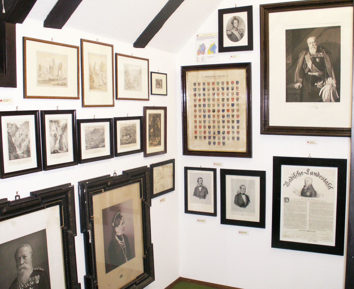 Bilder der Markgrafenfamilie, von Politikern und eine Wappenübersicht der badischen Städte im 19. Jahrhundert bezeugen die Akzeptanz der Neugliederung des badischen Staates auch hier im Oppenauer Tal.