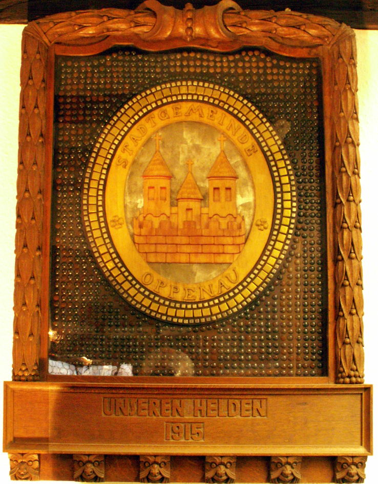 Die Bürger von Oppenau sammelten 1915 für die ersten Witwen und Waisen indem sie goldene, silberne und eiserne Nägel kauften, die um das Wappen herum eingeschlagen wurden. Die bedürftigen Kriegshinterbliebenen erhielten so 1.979 Reichsmark.