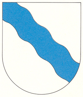 In Blau ein oben von zwei, unten von einem sechsstrahligen goldenen Stern begleiteter silberner Balken, aus dem unteren Schildrand hervorkommend drei silberne Berge (Backmund).
