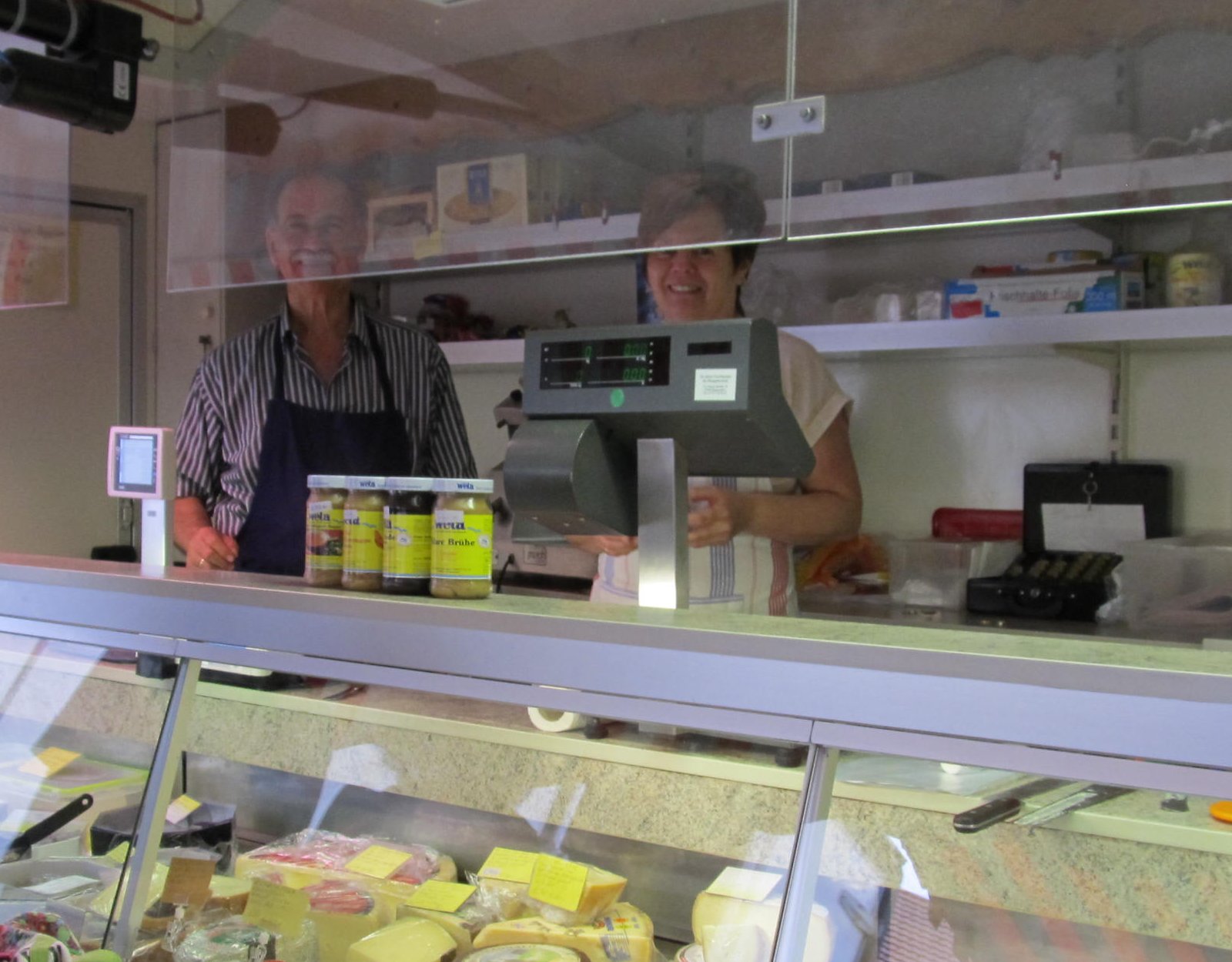 Angebotene Waren: Obst und Gemüse aus eigenem Anbau, Rahmkäse aus eigener Herstellung